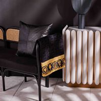 يضفي هذا الغطاء من فيرساتشي رونقًا خاصًّا في أي مساحة، سواء تم استخدامه كوشاح أو على السرير أو الأريكة أو كغطاء عند الجلوس على الكراسي بقرب موقد النار الدافئ؛ حيث يتألق قماشه المنسوج بمظهر راقٍ باللون الأسود مع تزيينه بنقش بسيط وشعار فيرساتشي، لتحيط به حواف حريرية مزيّنة باللونين الذهبي والأسود. إنّه خيار رائع لإضفاء رونق إيطالي عريق على أي مناسبة.