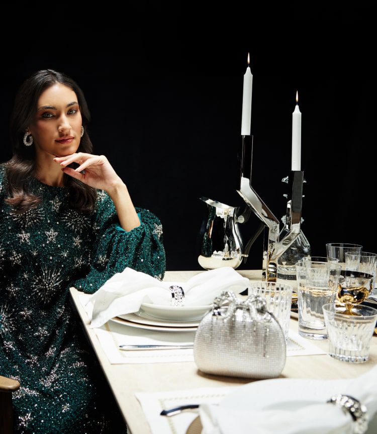 وفي قلب هذه الأجواء المترفة، تتحول المائدة إلى لوحة نابضة بالفخامة الراقية؛ حيث تعانق أدوات الفضة الفاخرة من كريستوفل تفاصيل فيرساتشي المميزة، لتغدو كل لحظة تجربة استثنائية تنبض بالذوق الرفيع. يضفي حامل الشموع "آبوريسانس" من كريستوفل وهجاً دافئاً على الطاولة، بينما تكتمل الصورة مع كؤوس باكارا وأطباق برناردو، ليصبح الإفطار الرمضاني احتفالاً بالفن والرقي، يتوج لحظات الشهر الفضيل بلمسات من السحر والتألق.