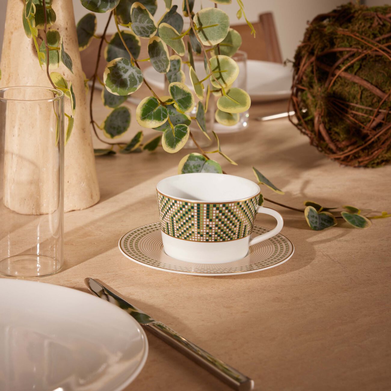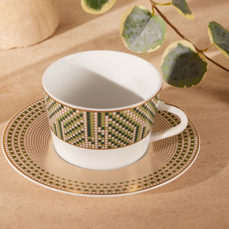 تعرّف على مفهوم مختلف للأناقة في الحياة اليومية مع هذا الفنجان وصحنه اللذين تقدّمهما برناردو مصنوعين من البورسلين الفاخر في تصميم مستوحى من فن الآرت ديكو يتسم بمركزه الأبيض المحاط بحواف مزيّنة بنقوش هندسية آسرة وتأثيرات من الحضارة الرومانية القديمة باللونين الذهبي والأخضر الفاتح، ليتكامل الفنجان مع الصحن بشكل رائع فيصوغا ثنائيًا مذهلًا يجعلهما خيارًا رائعًا لاحتساء الشاي بأسلوب راقٍ يثري لحظات تناول هذا المشروب الدافئ رشفة بعد رشفة بما يعبر عن ذوقك الرفيع.