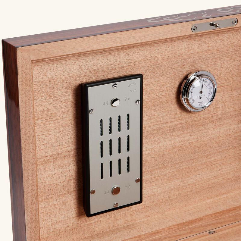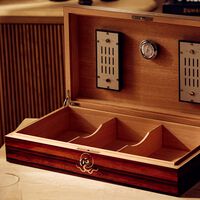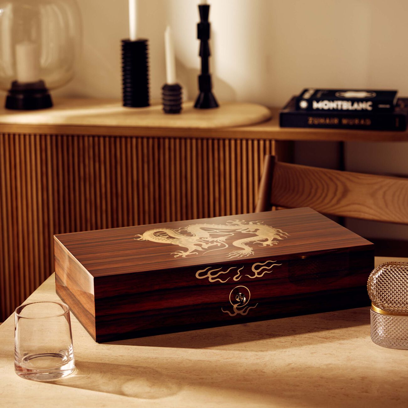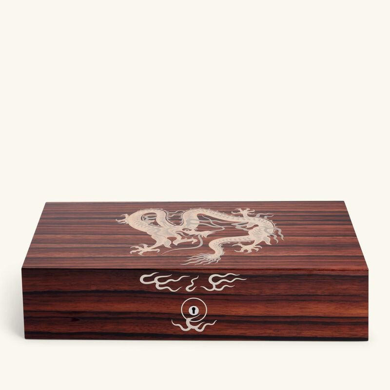 استمتع بتدخين سيجارك المفضل مع صندوق حفظ السيجار دراجون. يأتي هذا الصندوق المستطيل المصنوع من الخشب البني بتصميم تنين مميز على الغطاء يرمز إلى الصمود والنجاح والخلود في علم الفلك الصيني. يضفي العمل الفني المعقد لمسة من الأناقة على القطعة ويضمن حفظ سيجارك في أفضل الظروف. إنه الخيار الأمثل لعشاق السيجار وهواة القطع الفنية، حيث يجمع بين الجمال والعملية.