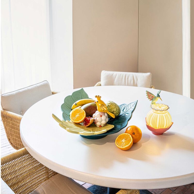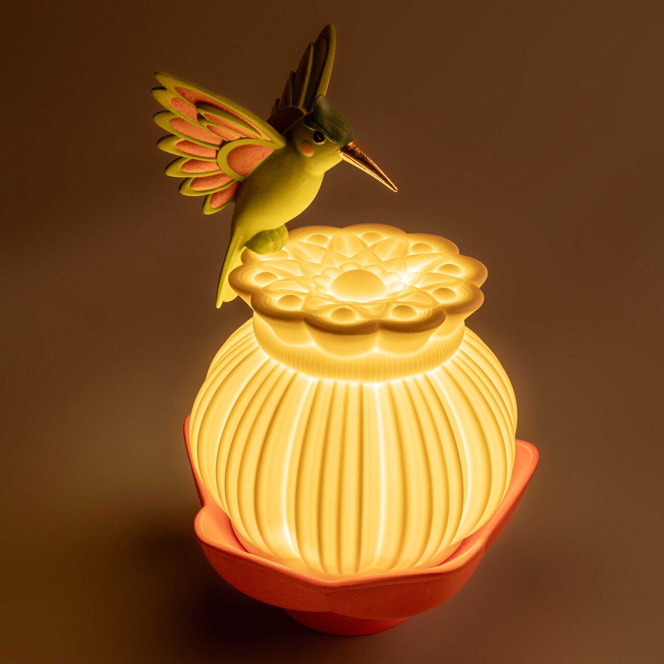تطرح دار لادرو مصباح يوتوبيكال اللاسلكي المصنوع من البورسلين الفاخر، والذي يأتي بتصميم مميز مع غطاء على شكل زهرة رقيقة. يزهو بشكل يحاكي طائر الطنان المزين بتفاصيل ذهبية لامعة على منقاره وجناحيه. ينبعث من المصباح ضوء خافت بفضل وحدة LED المدمجة مع سطوع قابل للتعديل ومفتاح يعمل باللمس. يأتي هذا المصباح بتصميم لاسلكي وبضوء يدوم لمدة تصل إلى 7 ساعات. يبعث ضوئه لمسة من الدفء والألفة على أي مكان وهو الأفضل للطاولات الجانبية أو أي زاوية في المنزل.