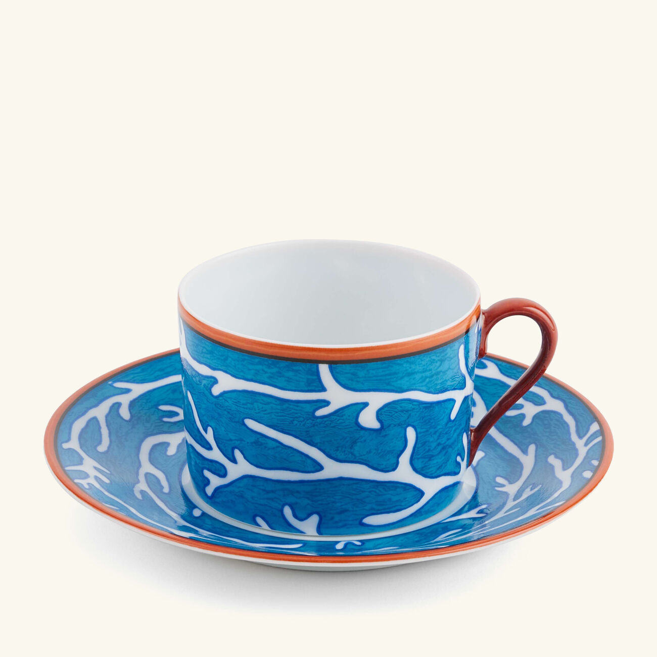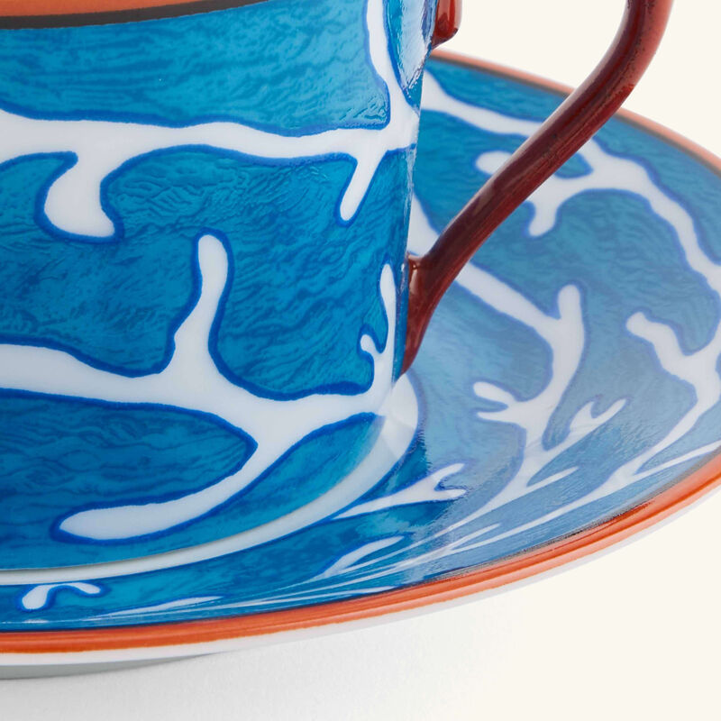 يزهو هذا الفنجان وصحنه بتصميم رائع من البورسلين عالي الجودة المزيّن بنقوش بيضاء وزرقاء على شكل شعب مرجانية، فيما تحيط بهما حواف ذهبية ليضفيا مذاقًا جماليًا خاصًّا على أوقات احتساء الشاي مع حفظ دفئ هذا المشروب اللذيذ.