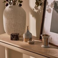 تطرح صلصال هذا الطقم الفاخر المؤلف من مبخرة وعلبة للحلى والمجوهرات في تصميم مصنوع من البورسلين الفاخر مع لمسات ذهبية برّاقة ليصوغا معًا مشهدًا يجمع بانسجام ما بين العراقة والعملية؛ حيث استلهمت الدار زخارف المبخرة الذهبية من عالم أشجار النخيل وثمار البلح في لفتة تحمل رمزية ثقافية خاصة، بينما تتمتع العلبة بملامح جميلة كي تحفظ مقتنياتك العزيزة عليك بكل رقي وأناقة. إنّه ثنائي مميّز من شأنه إثراء مساحاتك بحضوره الآسر ليضفي مزيدًا من الدفء والصفاء على أي مناسبة.
