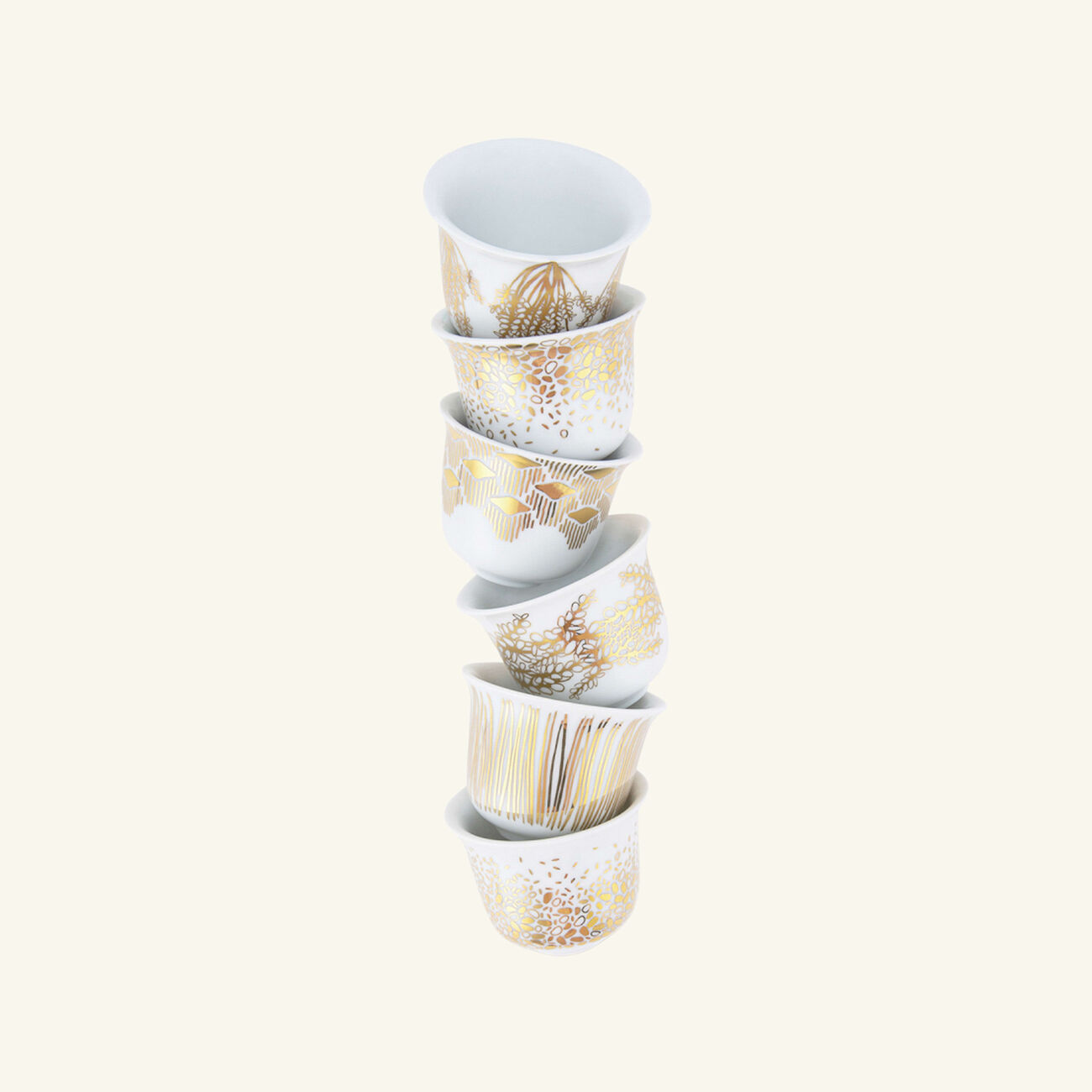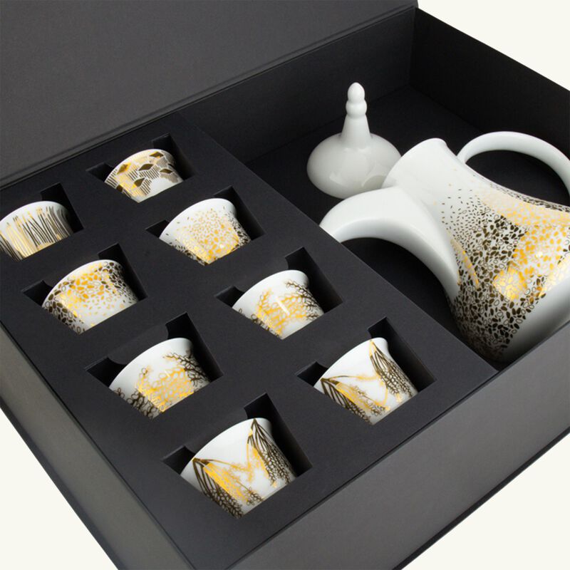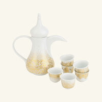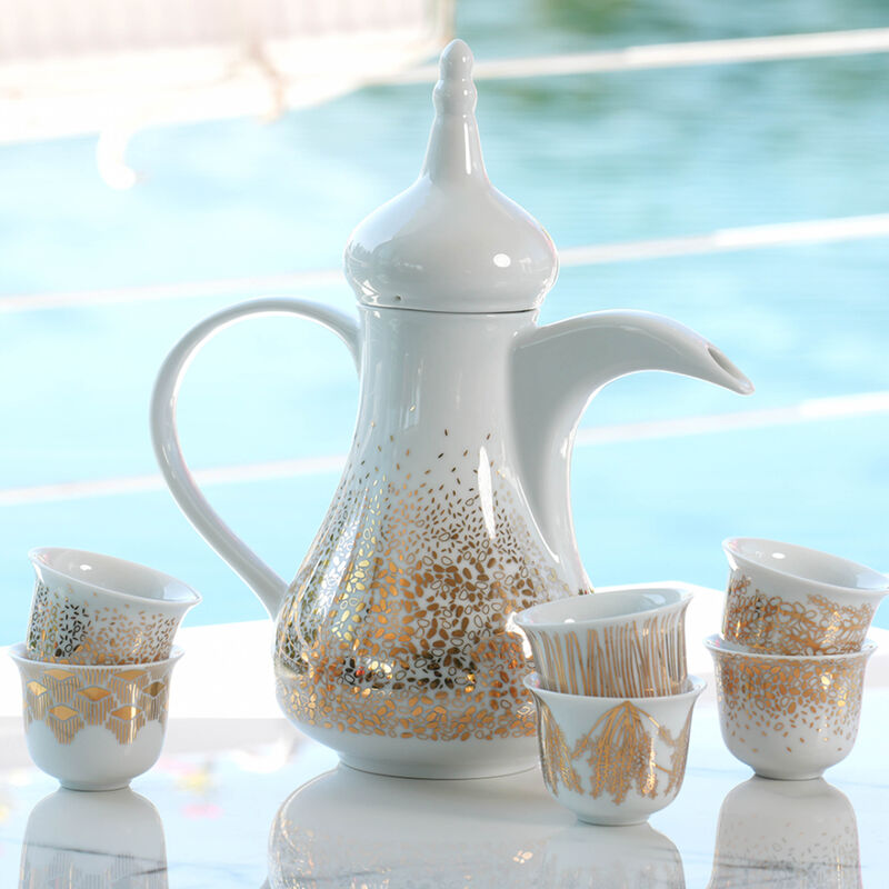 احتفِ بالجمال الأصيل مع هذا الطقم المؤلف من دلة قهوة و8 فناجين ضمن علبة هدايا فاخرة، وذلك في تصاميم مصنوعة من البورسلين الفاخر مع لمسات ذهبية مستوحاة من أشجار النخيل وثمار البلح والتقاليد العربية الأصيلة. كما أنه قابل للغسل في آلة غسيل الأطباق، ما يجعله خيارًا عمليًا لمن يقدّر اللحظات المميّزة التي تنبض بالأصالة الثقافية وتفيض بالفخامة والرقي والذوق الرفيع لتمنح هذا المشروب اللذيذ مذاقًا جماليًا خاصًا رشفة بعد رشفة.