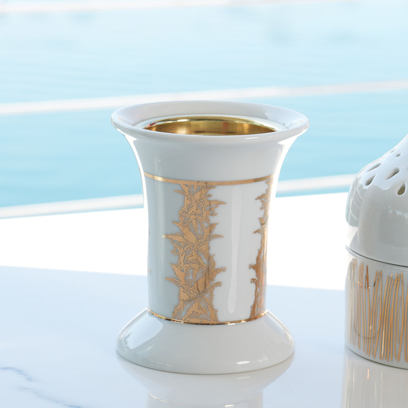 أثرِ أجواءك مع هذه المبخرة التي تجمع بكل انسيابية ما بين التقاليد العريقة والأناقة العصرية بتصميمها المصنوع من البورسلين الفاخر مع لمسات ذهبية فاخرة ونقوش مستوحاة من أشجار النخيل وثمار التمر، ما ينبض بالغنى والرقي الثقافيين. لا شك بأن هذه التحفة، التي يمكن غسلها في آلة غسيل الأطباق، ستكون خيارًا نموذجيًا لمن يعشق الأصالة والجمال والعناية الفائقة بأدق التفاصيل لأجواء تنبض بالدفء والصفاء.
