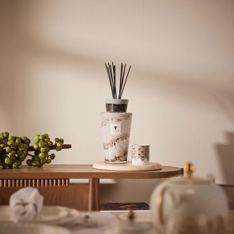 أضفِ نفحة زكية على منزلك مع هذه الشمعة المميّزة التي تطرحها صلصال مع إثرائها بخلطة عطرية تنبض بأريج الورد وعبق العود الزكي لتبعث على أجمل مشاعر الهدوء والصفاء، بينما يتزيّن سطحها بنقوش ذهبية مستوحاة من أشجار النخيل والتمور كي تضفي لمسة من الأناقة على أي مساحة من منزلك إذ تنير المكان ببصيصها الذي يدوم طويلًا وتنثر في الأجواء روائحها الآسرة التي تستحوذ على المخيلة.