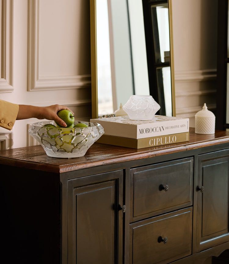 Reimagine classic silhouettes in a contemporary space, highlighting sleek shapes that are both artistic and functional. Style your console table with symmetry, framing crystal bowls and sculptures with an ornate mirror. Create simplicity with a stack of Assouline books, balancing proportions without overpowering the space. Add a candle for the finishing touch, uplifting the ambiance of any room.